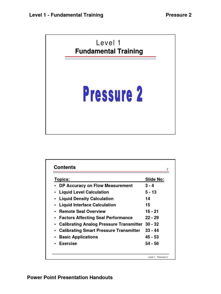 Topics: DP Accuracy on Flow Measurement Liquid Level Calculation Liquid Density Calculation Liquid Interface Calculation Remote Seal Overview Factors Affecting Seal Performance Calibrating Analog Pressure Transmitter Calibrating Smart Pressure Transmitter Basic Applications Exercise Slide No: 3-4 5 - 13 14 15 16 - 21 22 - 29 30 - 32 33 - 44 45 - 53 54 - 56