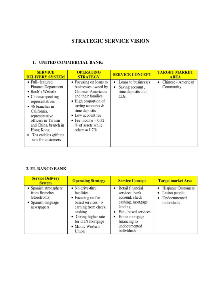 Service Delivery System Spanish atmosphere from Branches (storefronts) Spanish language newspapers. Operating Strategy No drive-thru facilities Focusing on feebased services => earning from check cashing Giving higher rate for ITIN mortgage Mimic Western Union Service Concept Retail financial services: bank account, check cashing, mortgage lending Fee - based services Home mortgage financing to undocumented individuals Target market Area Hispanic Customers Latino people Undocumented individuals