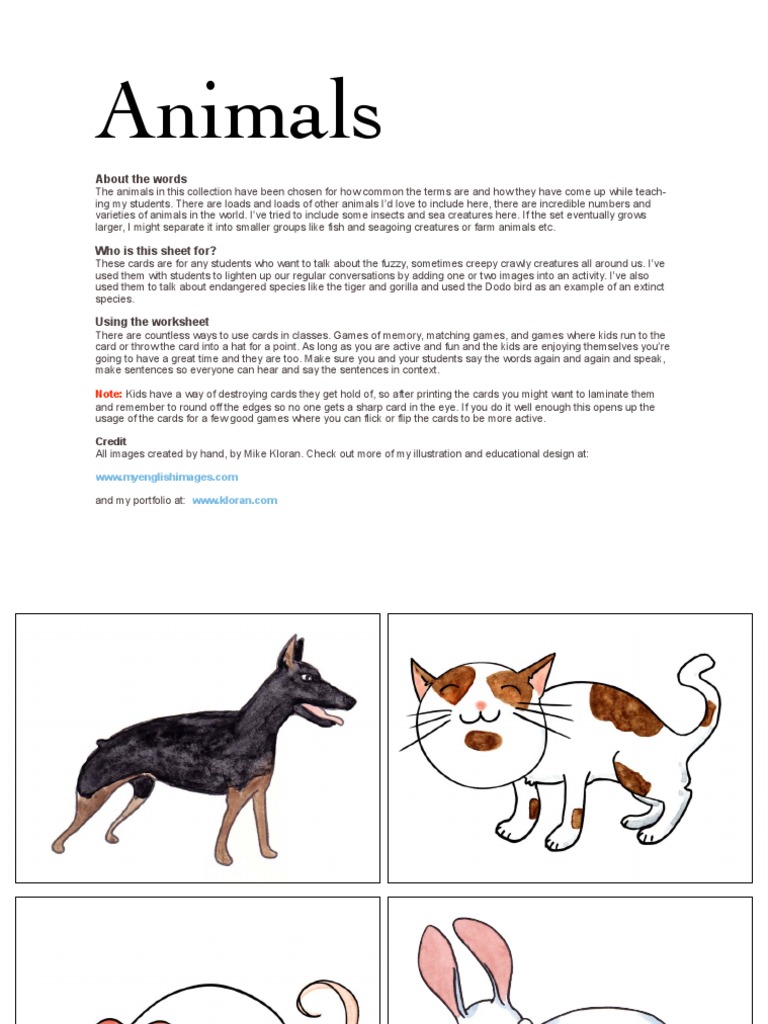 There are countless ways to use cards in classes. Games of memory, matching games, and games where kids run to the card or throw the card into a hat for a point. As long as you are active and fun and the kids are enjoying themselves youre going to have a great time and they are too. Make sure you and your students say the words again and again and speak, make sentences so everyone can hear and say the sentences in context. Note: Kids have a way of destroying cards they get hold of, so after printing the cards you might want to laminate them and remember to round off the edges so no one gets a sharp card in the eye. If you do it well enough this opens up the usage of the cards for a few good games where you can flick or flip the cards to be more active. Credit All images created by hand, by Mike Kloran. Check out more of my illustration and educational design at: www.myenglishimages.com and my portfolio at: www.kloran.com
