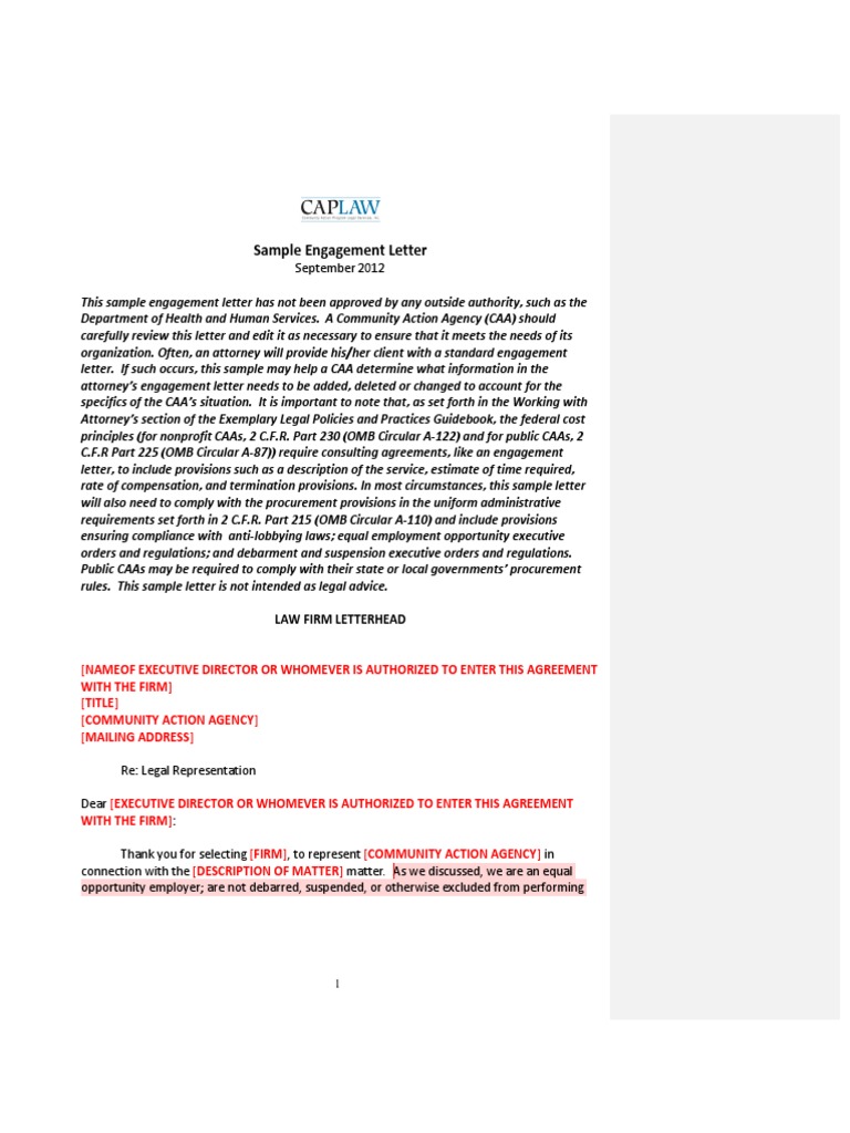 September 2012 This sample engagement letter has not been approved by any outside authority, such as the Department of Health and Human Services. A Community Action Agency (CAA) should carefully review this letter and edit it as necessary to ensure that it meets the needs of its organization. Often, an attorney will provide his/her client with a standard engagement letter. If such occurs, this sample may help a CAA determine what information in the attorneys engagement letter needs to be added, deleted or changed to account for the specifics of the CAAs situation. It is important to note that, as set forth in the Working with Attorneys section of the Exemplary Legal Policies and Practices Guidebook, the federal cost principles (for nonprofit CAAs, 2 C.F.R. Part 230 (OMB Circular A-122) and for public CAAs, 2 C.F.R Part 225 (OMB Circular A-87)) require consulting agreements, like an engagement letter, to include provisions such as a description of the service, estimate of time required, rate of compensation, and termination provisions. In most circumstances, this sample letter will also need to comply with the procurement provisions in the uniform administrative requirements set forth in 2 C.F.R. Part 215 (OMB Circular A-110) and include provisions ensuring compliance with anti-lobbying laws; equal employment opportunity executive orders and regulations; and debarment and suspension executive orders and regulations. Public CAAs may be required to comply with their state or local governments procurement rules. This sample letter is not intended as legal advice. LAW FIRM LETTERHEAD
