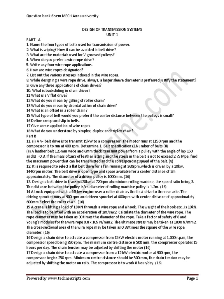 Question bank 6 sem MECH Anna university DESIGN OF TRANSMISSION SYSTEMS UNIT-1 PART - A 1.