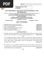 Question bank 6 sem MECH Anna university 14 When do you prefer helical gears than spur gears? 15 What is the major disadvantage of single helical gear? How can you over come that difficulty? 16 What hands of helix are used in parallel helical gears? 17 Define axial pitch of a helical gear? 18 Why is the crossed helical gear drive mostly not used for power transmission? 19 What is Herringbone gear? State its application. 20 Where do we use skew gears? Part B 11. (i) A pinion with 25 teeth and rotating at 1200rpm drives a gear which rotates at 200rpm and module is [Link] the center distance between the gears. (8) (ii) A helical gear with 300 helix angle has to transmit 35kW at 1500 rpm. With a speed reduction ratio 2.5. If the pinion has 24 teeth, determine the necessary module for 200 full depths the teeth. Assume 15Ni 2Cr 1 Mo 15 material for both pinion and wheel. (8) 12. Design a spur gear drive required to transmit 45 Kw at pinion speed of 800 rpm. The velocity ratio 3.5:1. The teeth are 20 full depths involute with 18 teeth on the pinion. Both the pinion gear are made of steel with a maximum safe static stress of 180N / mm2 (16) 13. Design a pair of helical gears to transmit 30kW power at a speed reduction ratio of 4:1. The input shaft rotates at 2000 rpm. Take helix and pressure angles equal to 250 and 200 respectively. The number of teeth on the pinion may be taken as 30 (16) 14 Design a straight spur gear drive to transmit 8 kW. The pinion speed is 720 rpm and the speed ratio is 2. Both the gears are made of the same surface hardened carbon steel with 55RC and core hardness less than 350 BHN. Ultimate strength is 720 N/mm2 and yield strength is 360 N/ mm2(16) 15 A motor shaft rotating at 1500 rpm has to transmit 15kW to a low speed shaft with a speed reduction of 3:1. Assume starting torque to be 25% higher than the running torque. The teeth are 200 involutes with 25 teeth on the pinion. Both the pinion and gear are made of C45 steel. Design a spur gear drive to suit the above conditions and check for compressive and bending stresses and plastic deformations. Also sketch the spur gear drive. (16) 16 An electric motor is to be connected to a reciprocating pump through a gear pair. The gears are overhanging in their shafts. Motor speed = 1440 rpm. Speed reduction ratio = 5. Motor power = 36.8 kW. The gears are to have 200 pressure angles. Design a spur gear drive. (16) 17 A pair of helical gears subjected to moderate shock loading is to transmit 37.5kW at 1750 r.p.m. of the pinion. The speed reduction ratio is 4.25 and the helix angle is 150. The service is continuous and the teeth are 200 FD in the normal plane. Design the gears, assuming a life of 10,000 hours. (16) 18.A compressor running at 300 rpm is driven by a15 Kw, 1200 rpm motor through a 14 0 full depth spur gears .The centre distance is 375 mm .The motor pinion is to be of C30 forged steel hardened and tempered, and the driven gear is to be of cast iron. Assuming medium shock condition, design the gear drive. (16) [Link] a spur gear drive required to transmit 15 Kw at pinion speed of 1400 rpm to a low speed shaft rotating at 500 rpm. The teeth are 20 degree full depth involute with 25 teeth on the pinion. Both the pinion and gear are made of CI with a maximum safe static stress of 56 N / mm2. (16) 20.A helical gear drive with the helix angle of 30 degree required to transmit 15 Kw at pinion speed of 10000 rpm. The velocity ratio 4:1. The teeth are 20 degree full depth involute with 25 teeth on the pinion. Both the pinion gear is made of hardened steel with a maximum safe static stress of 100N / mm2. The face width may be taken as 14 times the module. Find the module and face width. (16)