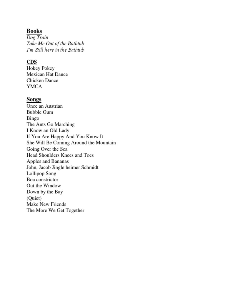 Once an Austrian Bubble Gum Bingo The Ants Go Marching I Know an Old Lady If You Are Happy And You Know It She Will Be Coming Around the Mountain Going Over the Sea Head Shoulders Knees and Toes Apples and Bananas John, Jacob Jingle heimer Schmidt Lollipop Song Boa constrictor Out the Window Down by the Bay (Quiet) Make New Friends The More We Get Together