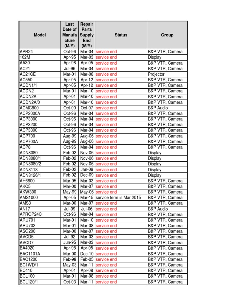 The document contains a list of models of broadcast equipment with their last date of manufacture, repair parts supply end date, status, and product group. It includes over 100 models rangin…