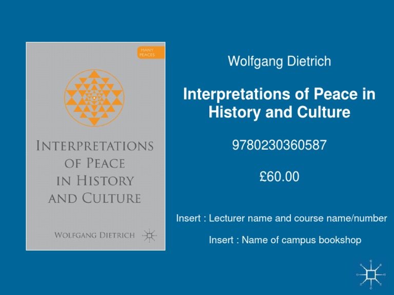 This document provides information about a book titled "Interpretations of Peace in History and Culture" by Wolfgang Dietrich. The book costs £60.00 and additional information is given about inserting a lecturer's name and course details as well as the campus bookshop name.