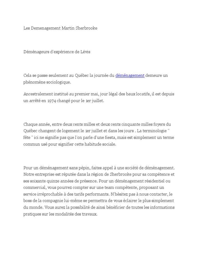 Pour un dmnagement sans ppin, faites appel une socit de dmnagement. Notre entreprise est rpute dans la rgion de Sherbrooke pour sa comptence et ses soixante quinze annes de prsence. Pour un dmnagement rsidentiel ou commercial, vous pourrez compter sur une team comptente, proposant un service irrprochable des tarifs performants. N'hsitez pas nous contacter, le boss de la compagnie lui-mme se permettra de vous clairer le plus simplement du monde. Vous aurez la possibilit de ainsi bnficier de toutes les informations pratiques sur les modalits des travaux.