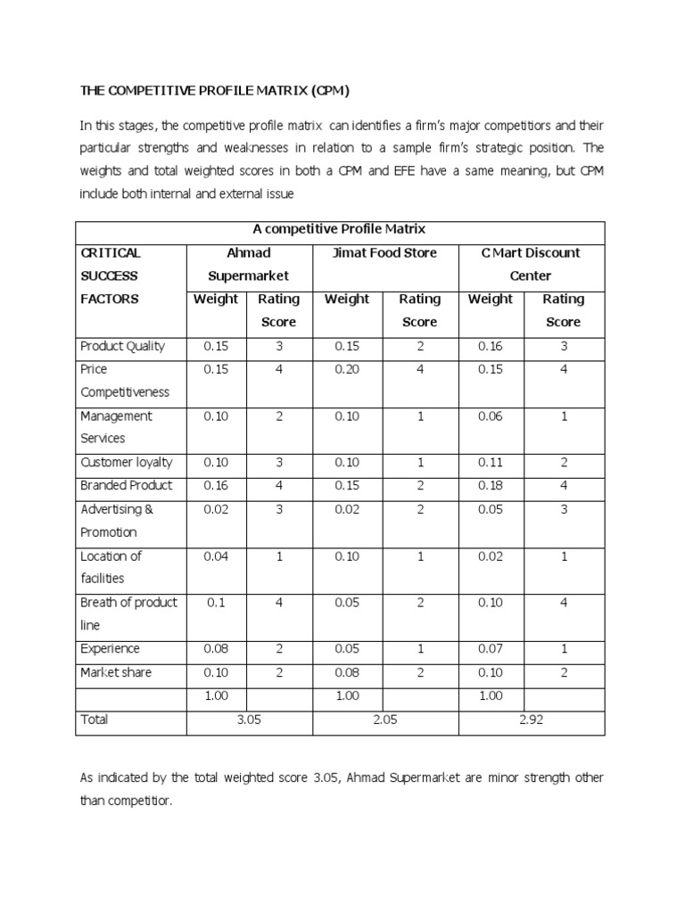 As indicated by the total weighted score 3.05, Ahmad Supermarket are minor strength other