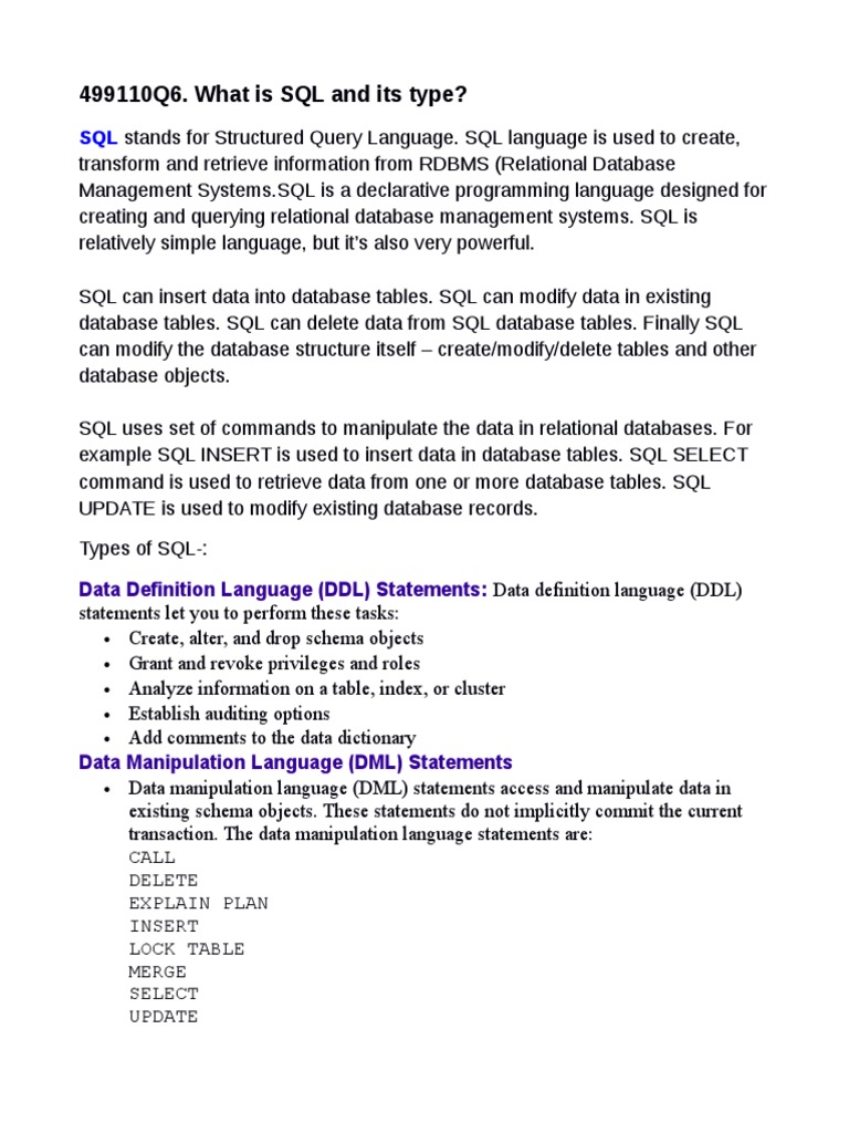 499110Q6. What is SQL and its type?