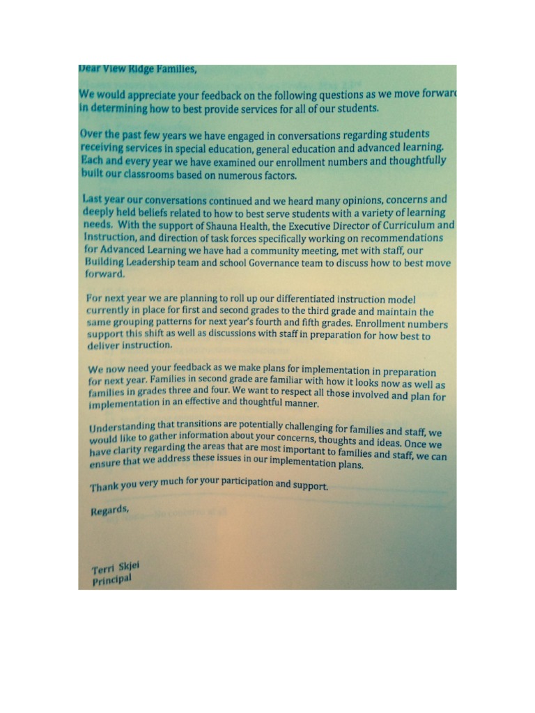 May 2014 letter from Principal Terri Skjei to View Ridge Elementary parents about the future of Seattle Schools' Advanced Learning program, Spectrum, at their school.