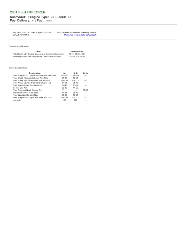 This document provides specifications for the front suspension of a 2001 Ford Explorer with a 4.0 liter V6 engine. It lists the ride height range for the original and new suspension components as 90-111 mm and 110-116 mm, respectively. It also provides torque specifications for various front suspension components, ranging from 7-11 Nm for the brake anti-lock sensor bolt to 150-200 Nm for the front suspension lower arm pivot bolts and nuts.
