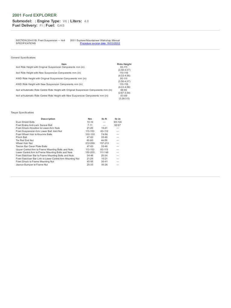 The document provides specifications for the front suspension of a 2001 Ford Explorer, including ride heights for different configurations and torque specifications for suspension components.