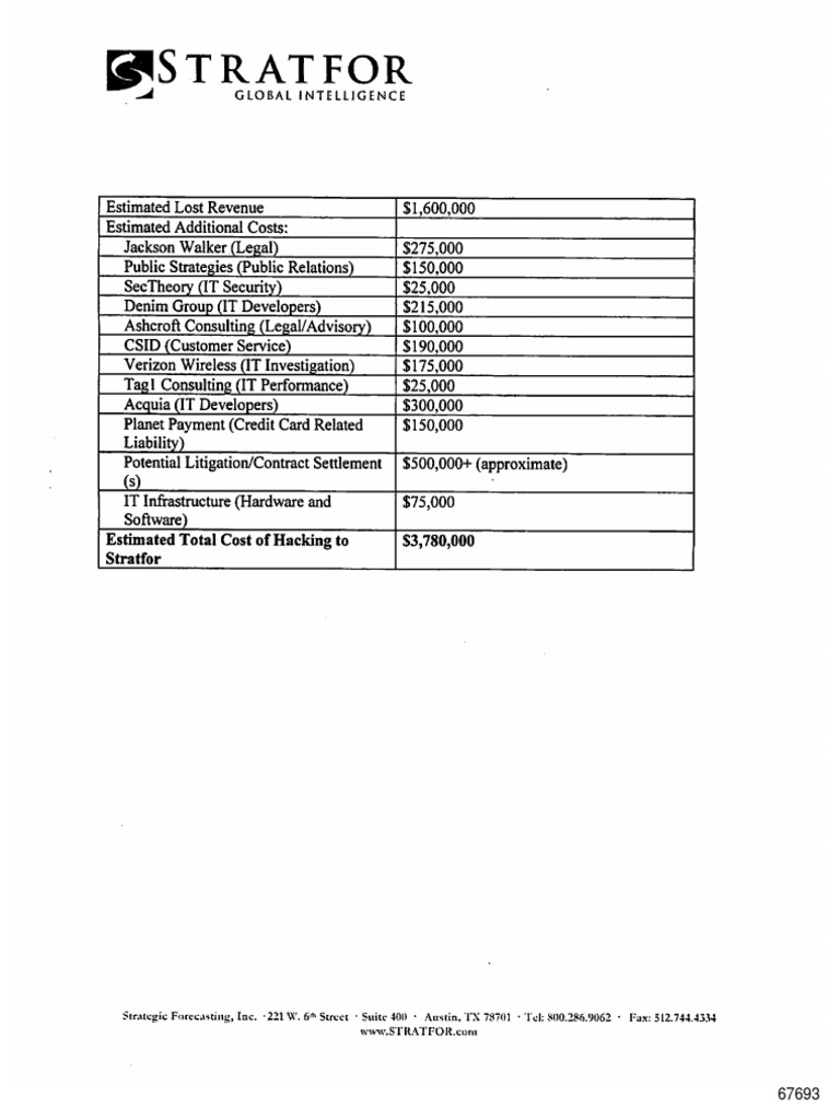 Itemized list of estimated damages resulting from the 2011 AntiSec hack of Strategic Forecast, Inc. (Stratfor).