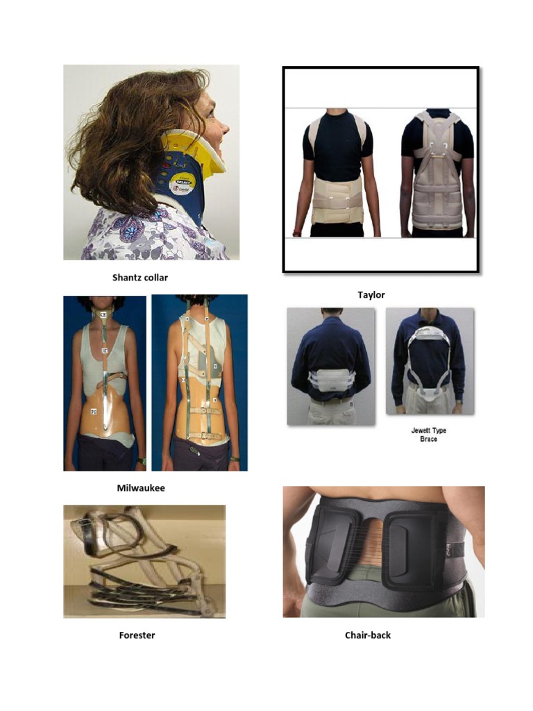 This document lists various types of medical devices and immobilizers including a Shantz collar, Forester splint, chair-back splint, bilateral leg brace, cocked-up splint, Denis browne splint, unilateral leg brace, Lively finger splint, Philadelphia collar, Yamamoto splint, Braun-bohler splint, and a sterno-occipito-mandicular immobilizer.