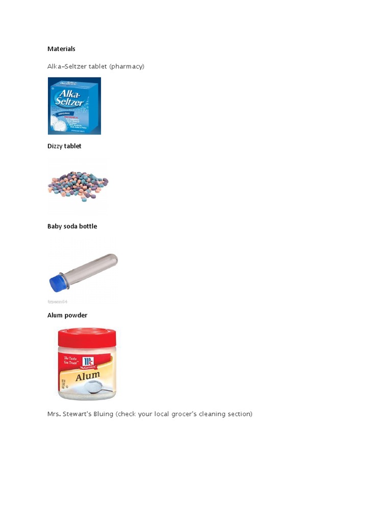 The document lists materials needed including an Alka-Seltzer tablet, Dizzy tablet, baby soda bottle, alum powder, and Mrs. Stewart's Bluing cleaning product.