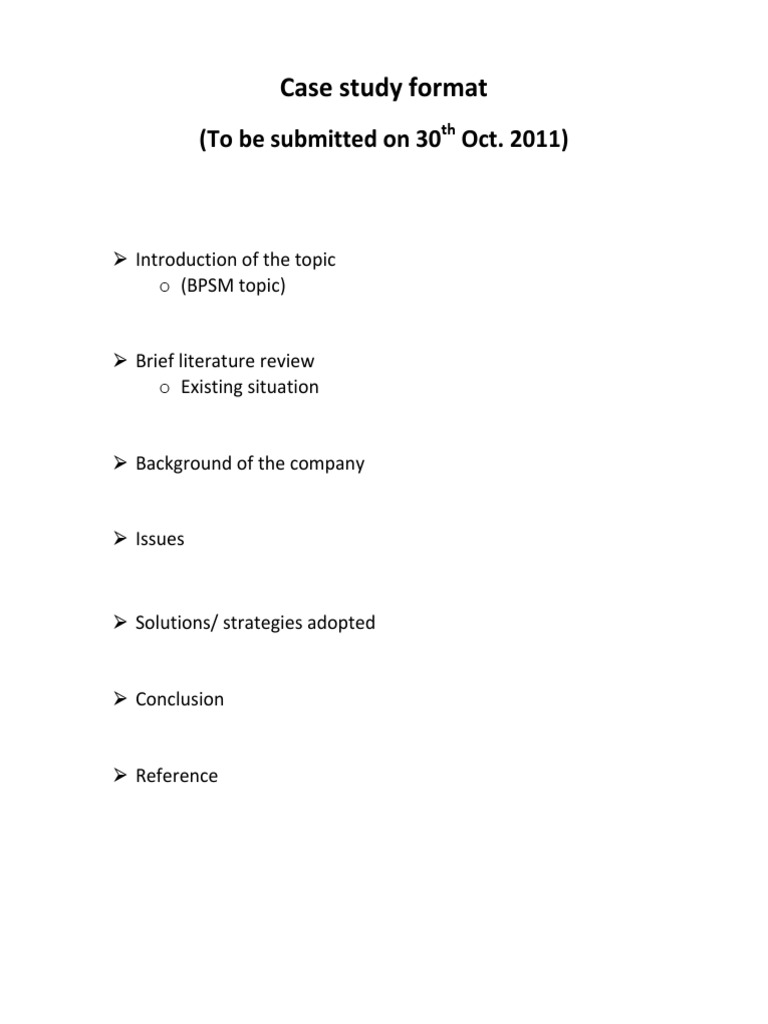 This case study document outlines the format for a business case study submission, including an introduction of the topic, brief literature review of the existing situation, background of the company, issues, solutions/strategies adopted, and conclusion with references.