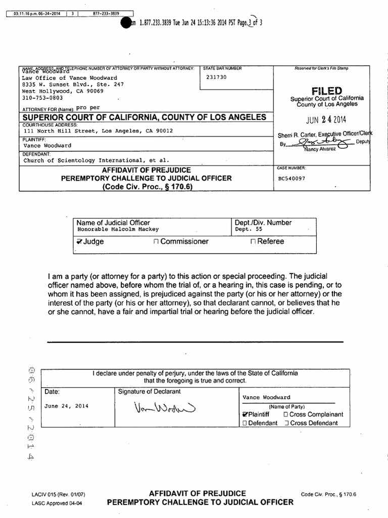 Woodward V Scientology: Peremptory Challenge by Woodward