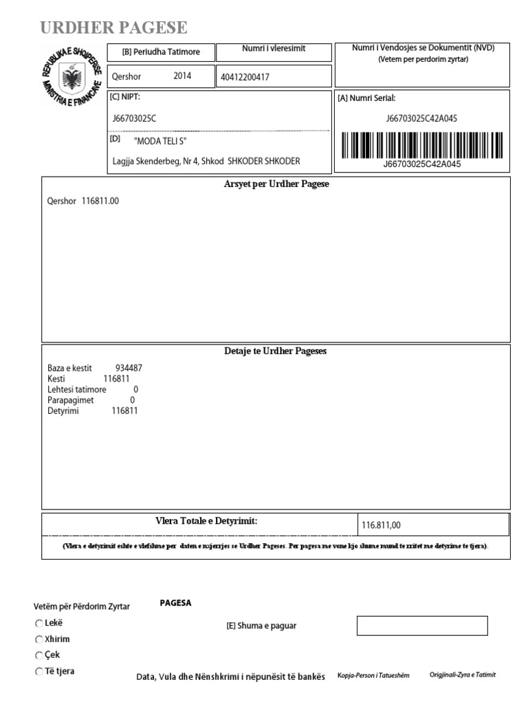 (Vlera e detyrimit eshte e vlefshme per daten e nxjerrjes se Urdher Pageses. Per pagesa me vone kjo shume mund te rritet me detyrime te tjera).