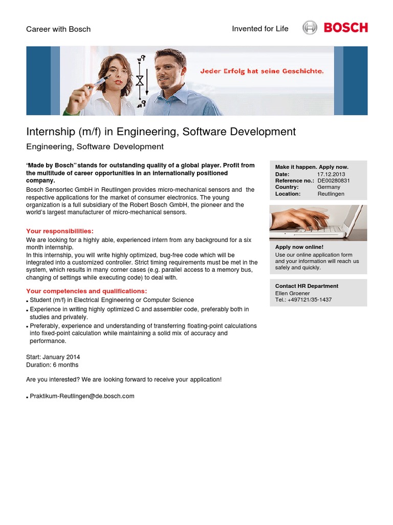 Bosch Sensortec GmbH in Reutlingen provides micro-mechanical sensors and the