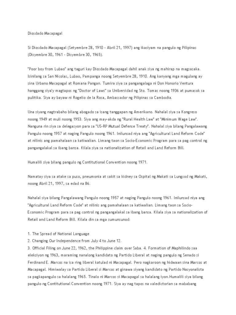 tinalo si Pangulong Diosdado Pangan Macapagal ni Ferdinand Marcos. Siya ay namatay noong ika-21 ng