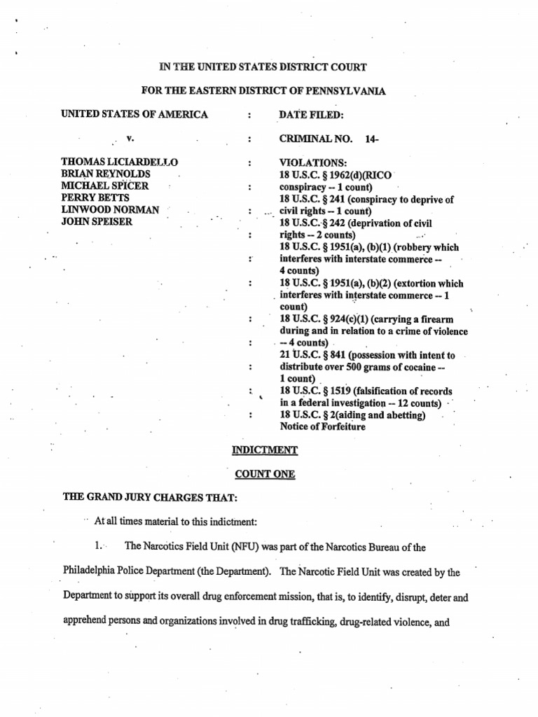 Six Philadelphia police narcotics officers - Thomas Liciardello, Brian Reynolds, Michael Spicer, Perry Betts, Linwood Norman, and John Speiser - were indicted on 29 July 2014. They face 26 charges, ranging from robbery, extortion, kidnapping, and records falsification.