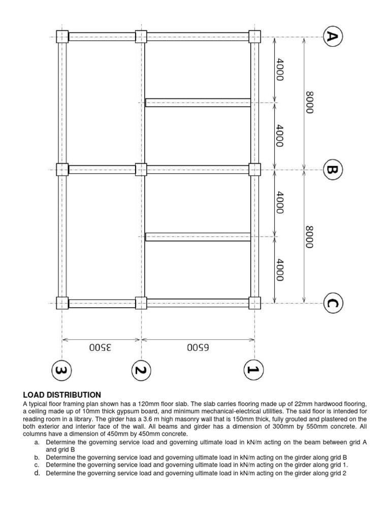 b. Determine the governing service load and governing ultimate load in kN/m acting on the girder along grid B