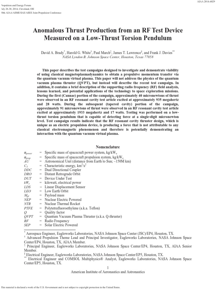 been studying microwave-driven resonant cavity thrusters. In 2013, they published a paper