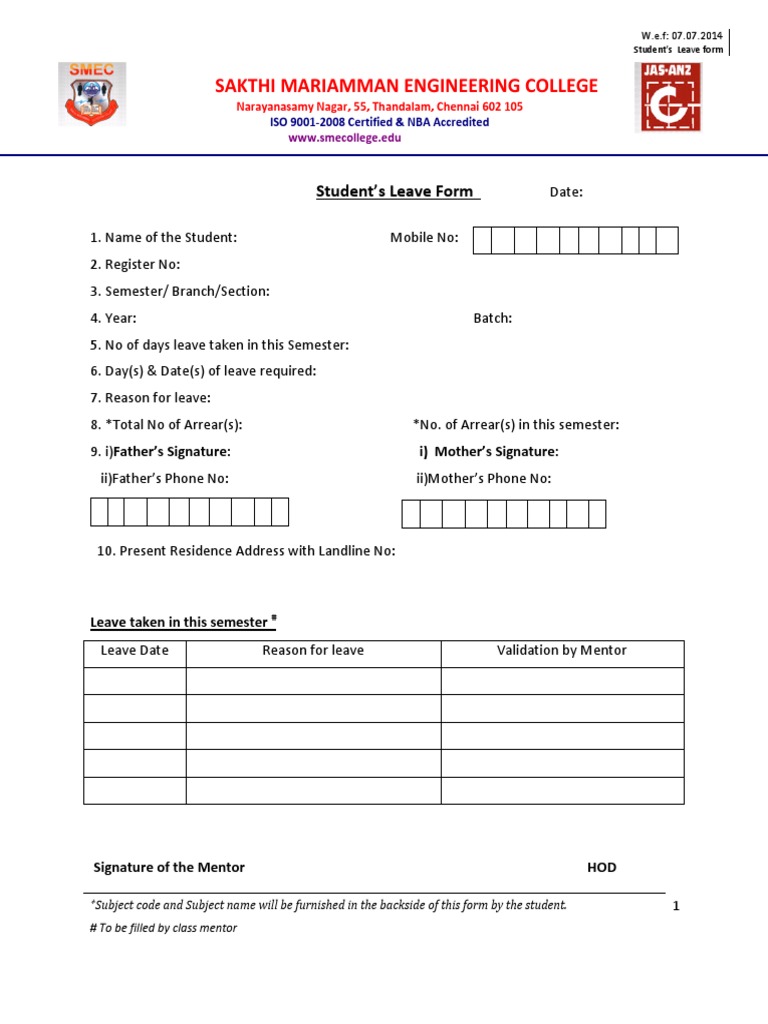 Students Leave form