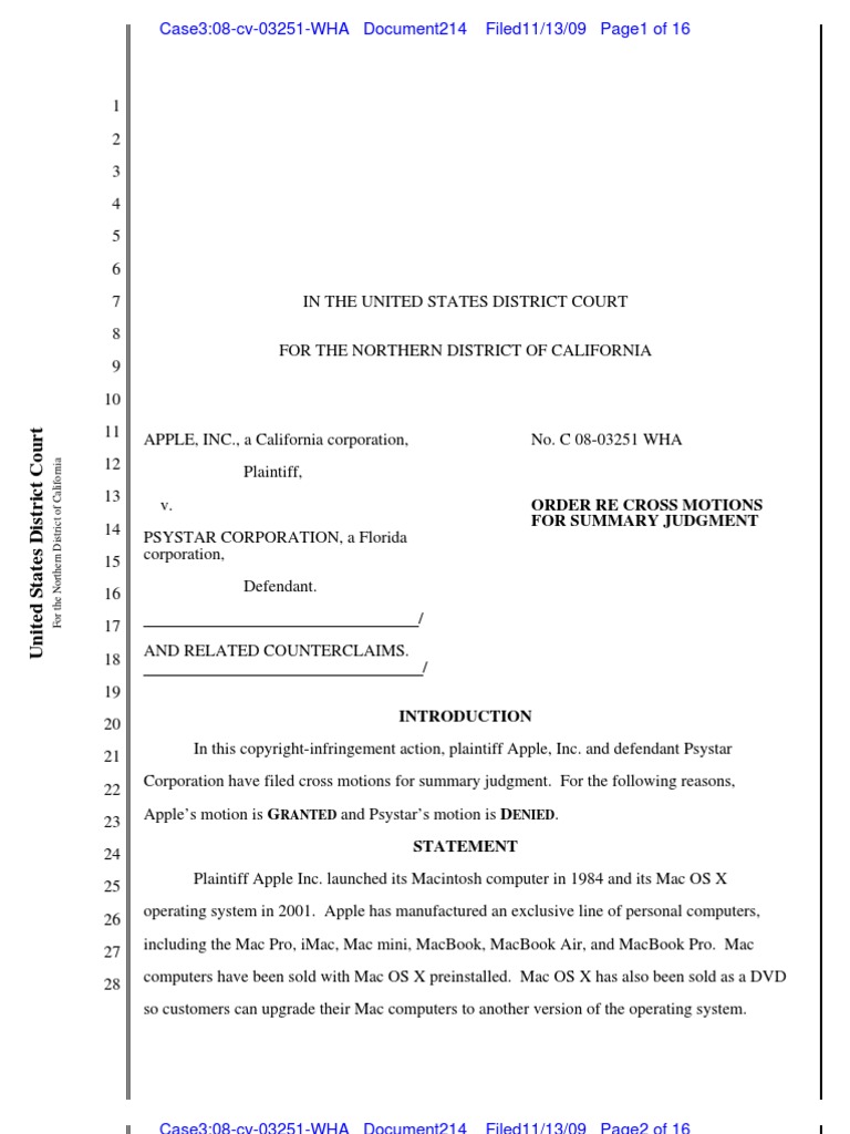21 For the foregoing reasons, Apple’s motion is GRANTED and Psystar’s motion is