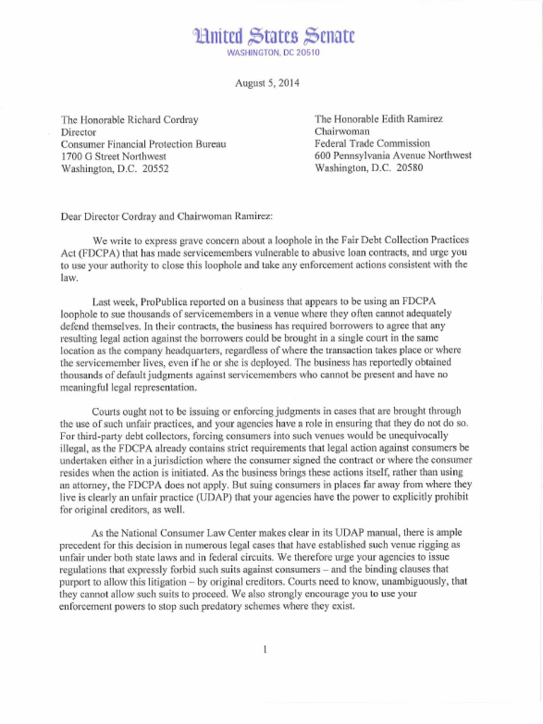 Senator Udall and several colleagues send a letter to Consumer Financial Protection Bureau (CFPB) Director Richard Cordray and Federal Trade Commission (FTC) Chairwoman Edith Ramirez, urging them to close a loophole in the Fair Debt Collection Practices Act (FDCPA) that leaves service members vulnerable to abusive loan contracts.