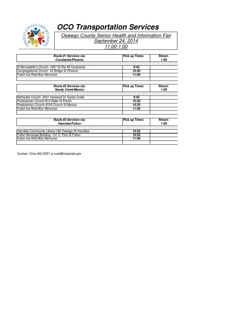 Oswego County Opportunities is providing bus service to the Senior Fair, being held on Sept, 24, 2014, at the Fulton Ice Arena.