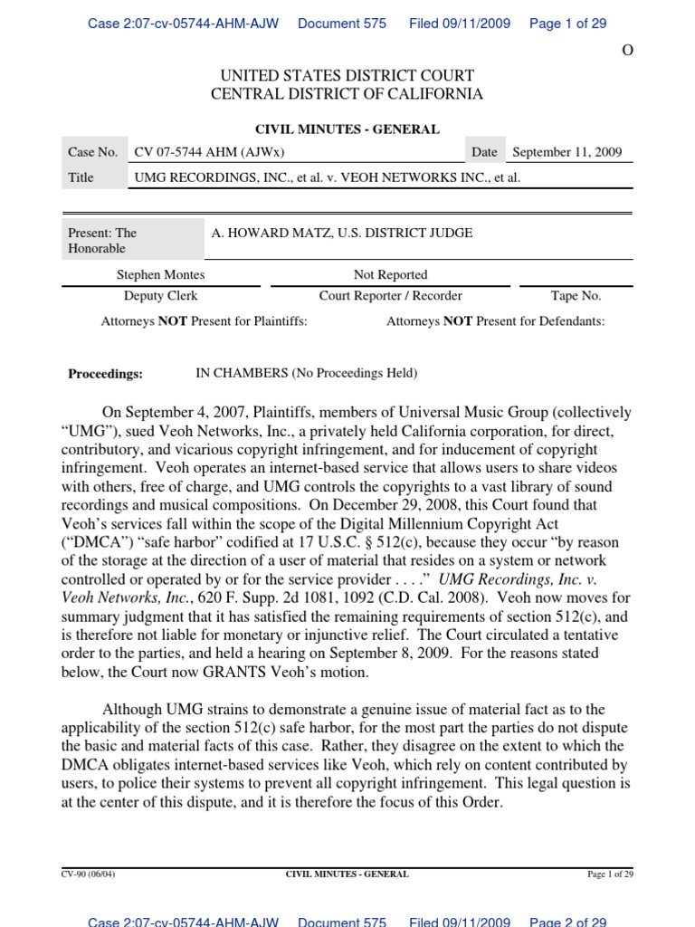 Civil Minutes - General: Veoh Networks, Inc., 620 F. Supp. 2d 1081, 1092 (C.D. Cal. 2008) - Veoh Now Moves For