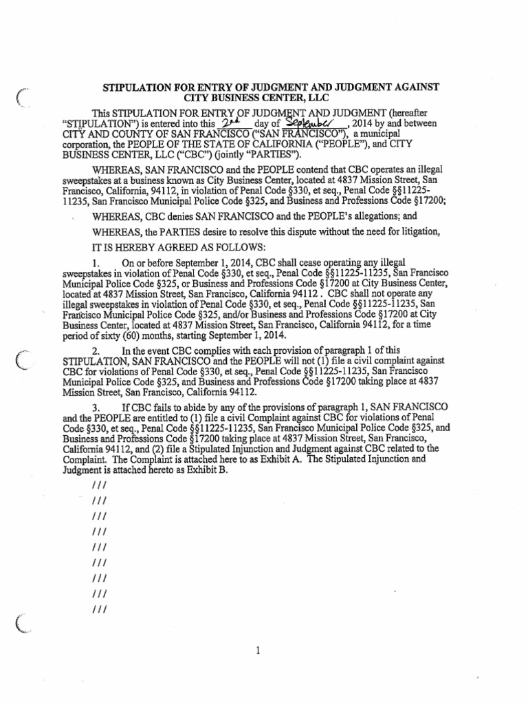 The agreement stipulating City Business Center must cease operating a gambling casino.