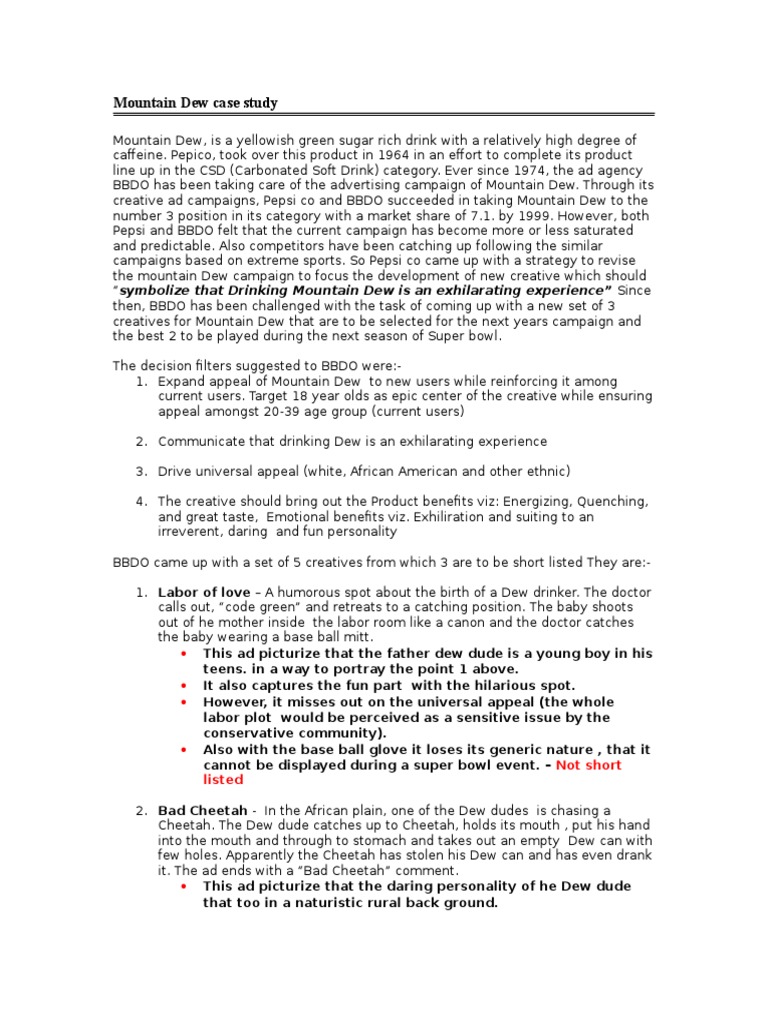 creative ad capaigns, Pepsi co and ((D) succeeded in taking Mountain Dew to the