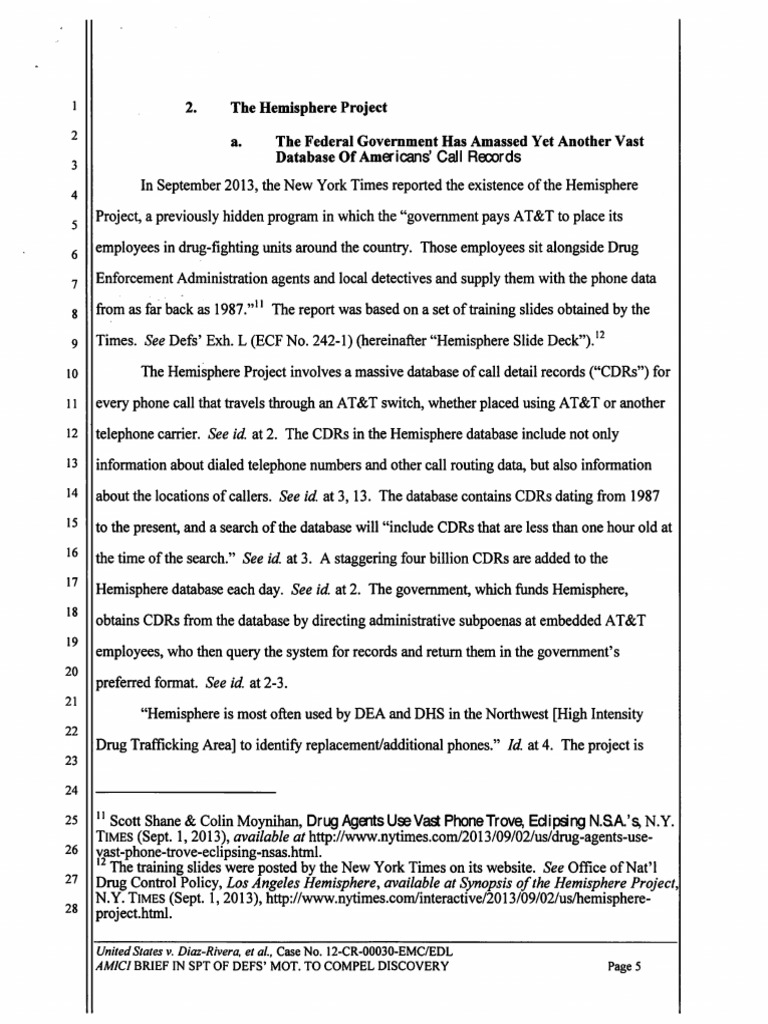 A four page section from an Electronic Frontier Foundation amicus brief filed on October 15th, 2013 in US v. Diaz-Rivera, et al. focused on the Drug Enforcement Administration's controversial Hemisphere phone record collection.