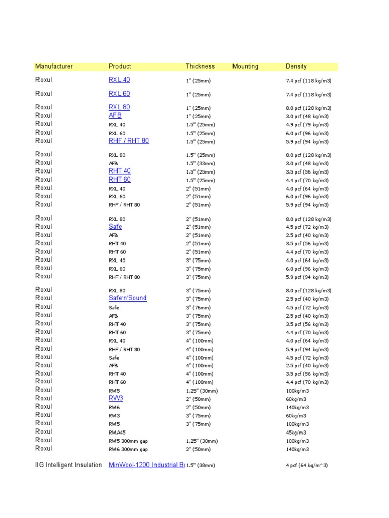 Manufacturer Product Thickness Mounting Density