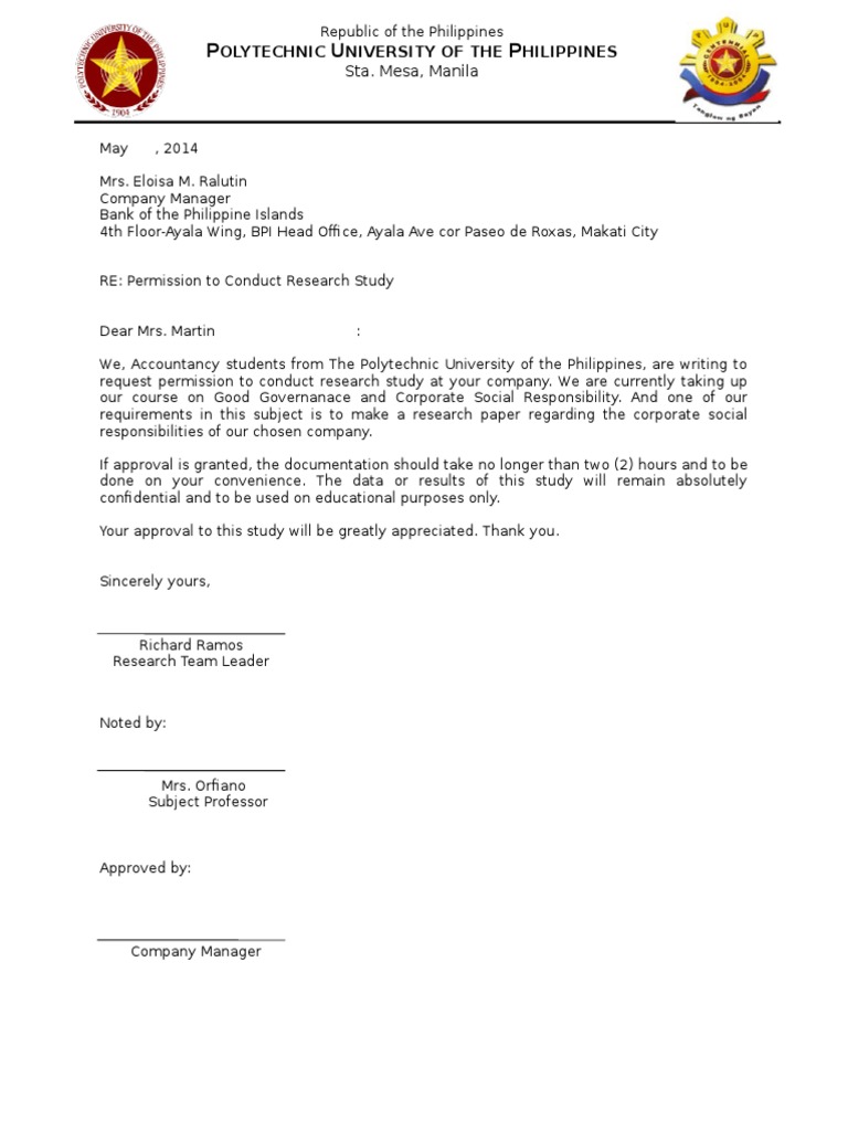 re2uest permission to con#uct research stu#y at your company. 'e are currently ta!ing up