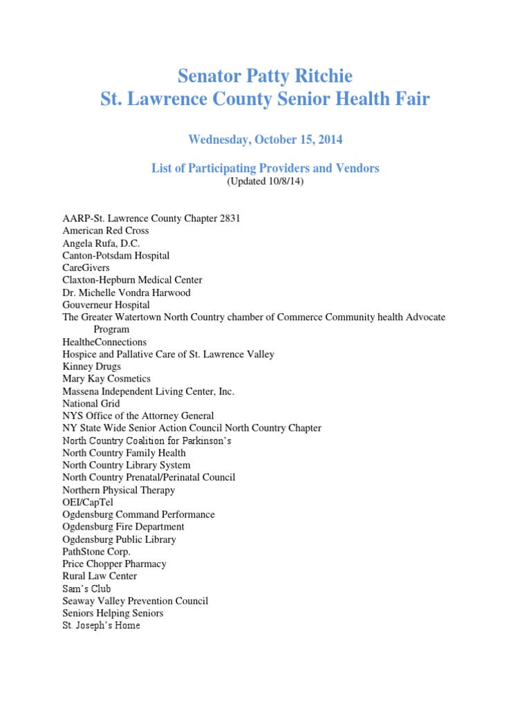 Senator Patty Ritchie is hosting the St. Lawrence County Senior Health Fair on Wednesday, October 15, 2014. The summary lists over 40 providers and vendors that will be participating in the …