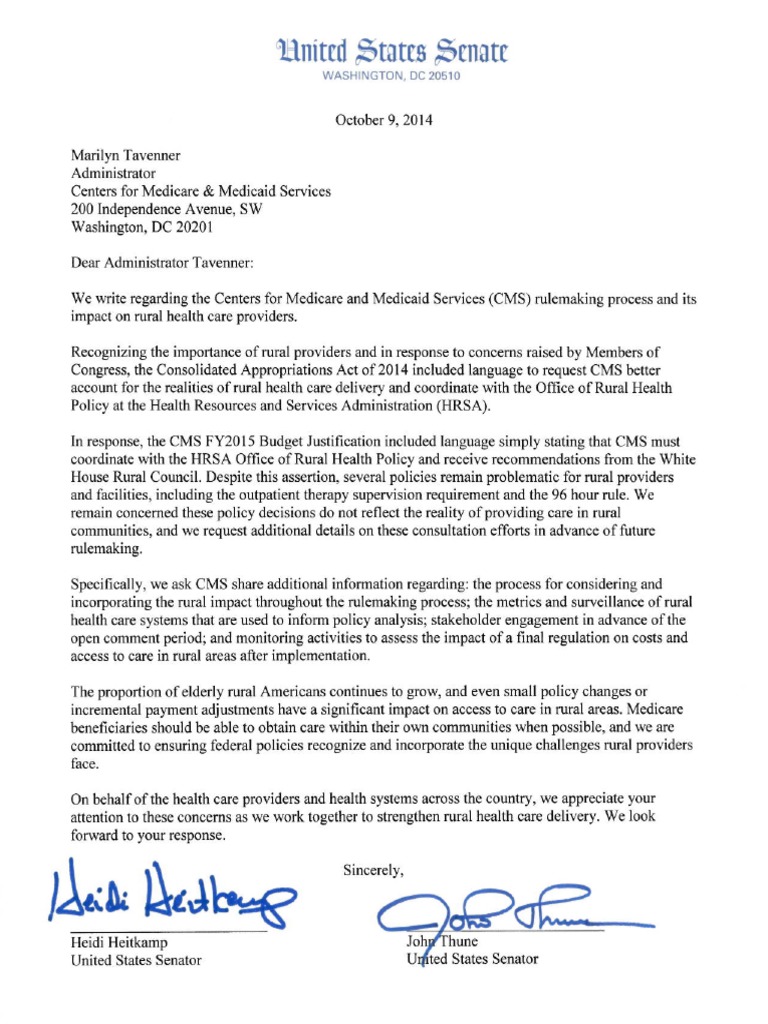 U.S. Senator Jerry Moran (R-Kan.) joined a bipartisan group of 33 senators in expressing concern to the Administration that federal rules for health care facilities do not adequately consider the impact these decisions have on rural communities.
