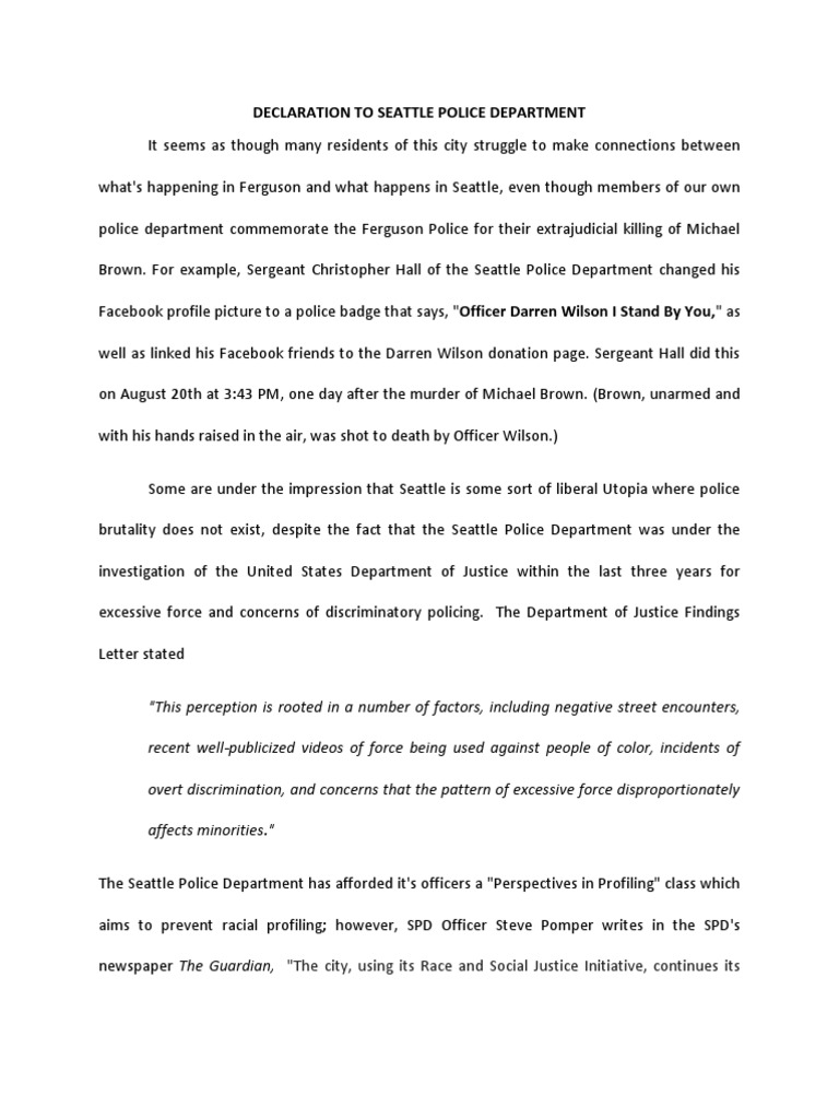 Declaration To Seattle Police Department From The Black Student Union at Garfield High, Seattle