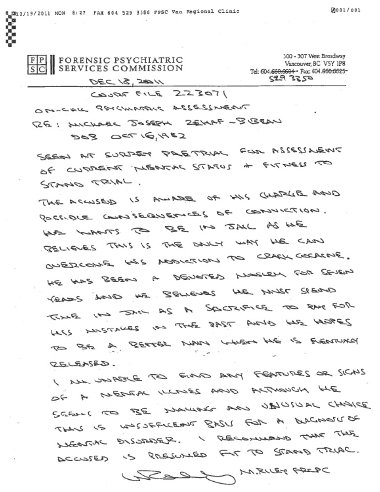 A Dec. 18, 2011 psychiatric assessment of Michael Joseph Zehaf-Bibeau.