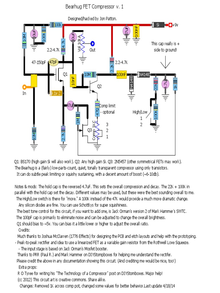 Notes & mods: The hold cap is the reversed 4.7uF. This sets the overall compression and decay. The 22K + 100K in