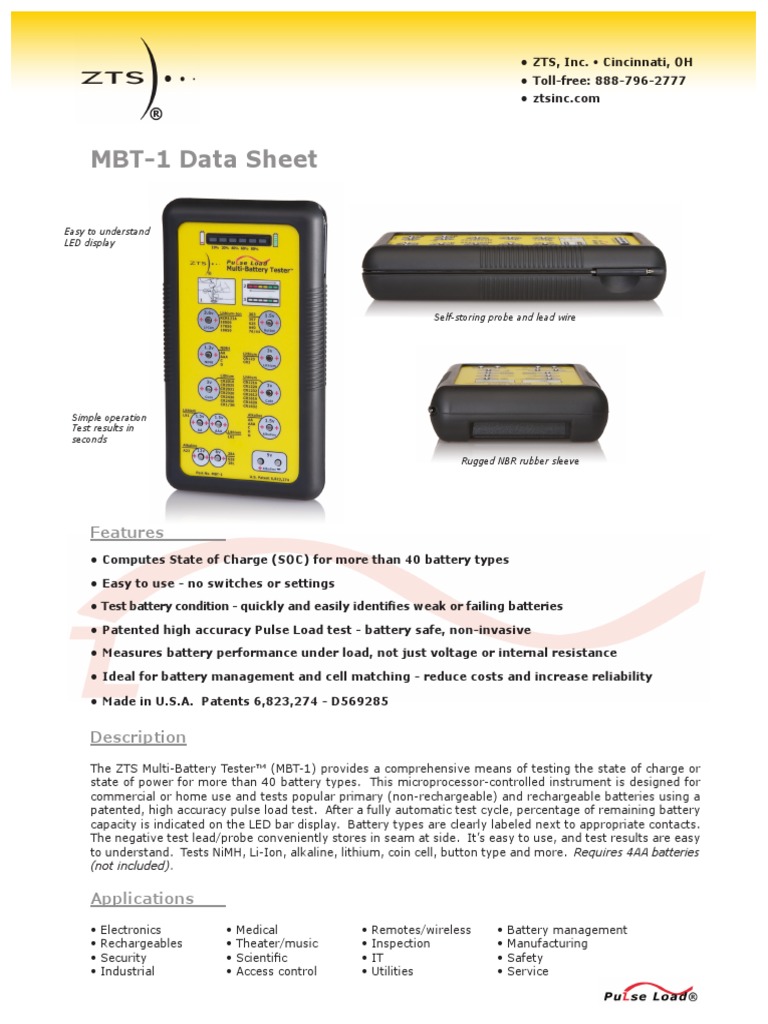 The ZTS Multi-Battery Tester (MBT-1) provides a comprehensive means of testing the state of charge or