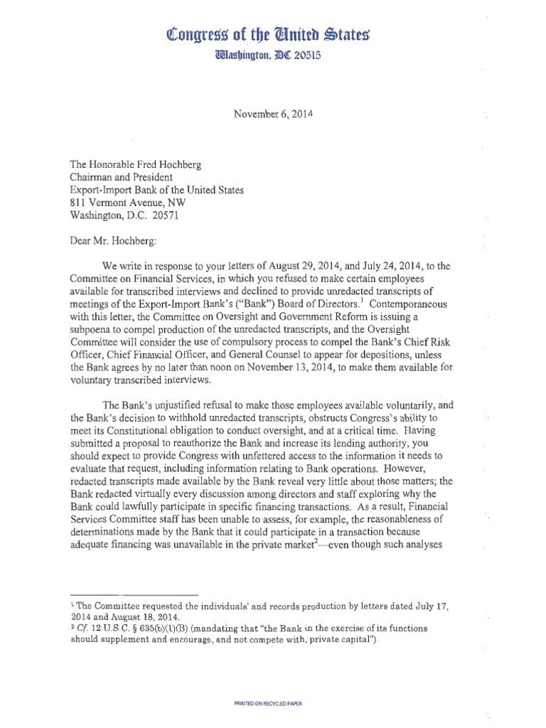 Republicans with the House Oversight and Government Reform and Financial Services Committees subpoenaed officials with the Export-Import Bank and requested transcripts from meetings of the b…