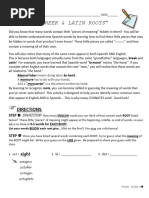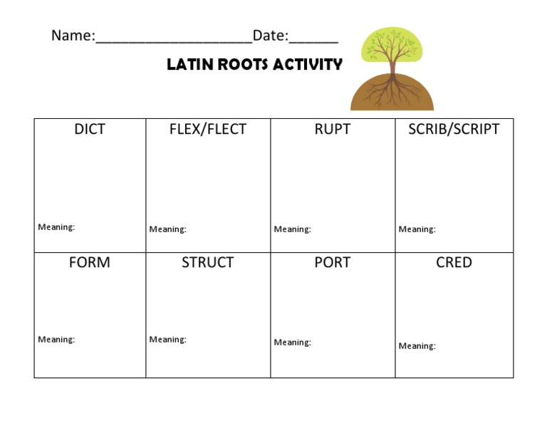This document is a worksheet asking students to fill in the meanings of 7 Latin roots: DICT, FORM, FLEX/FLECT, RUPT, STRUCT, SCRIB/SCRIPT, and PORT. Students are asked to provide the meaning for each Latin root listed.