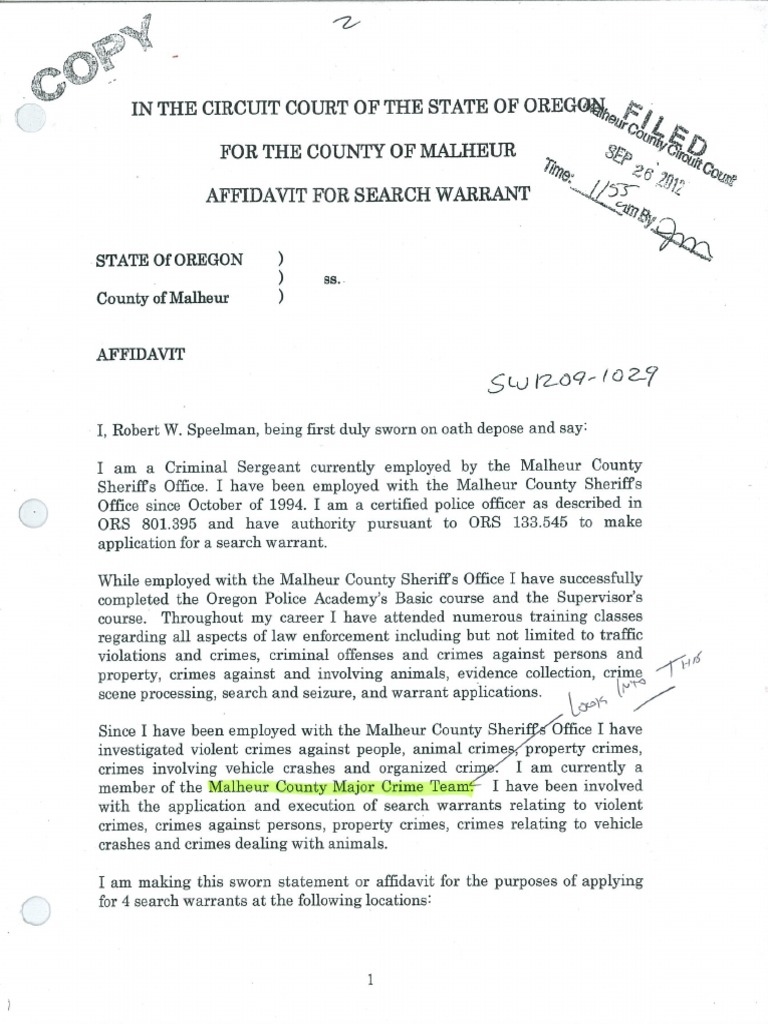 Search Warrant application cover page