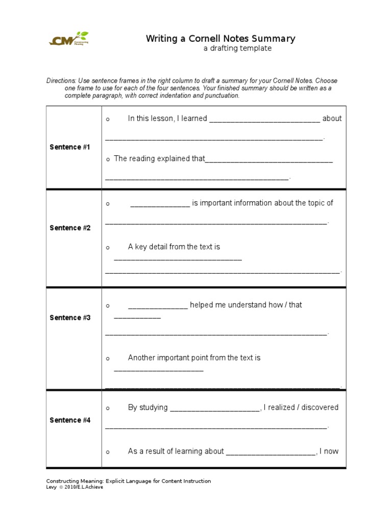 Directions: Use sentence frames in the right column to draft a summary for your Cornell Notes. Choose