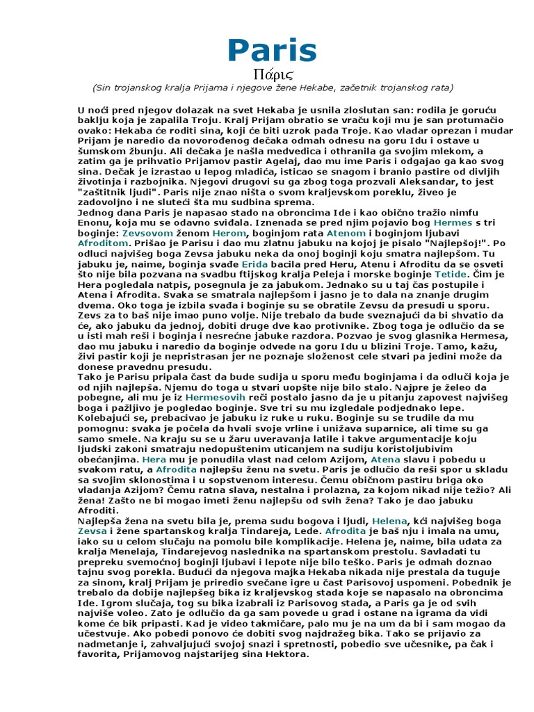 svakom ratu, a Afrodita najlepu enu na svetu. Paris je odluio da rei spor u skladu