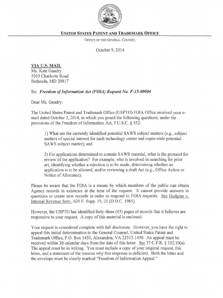 A description of the U.S. Patent and Trademark Office's Sensitive Application Warning System.