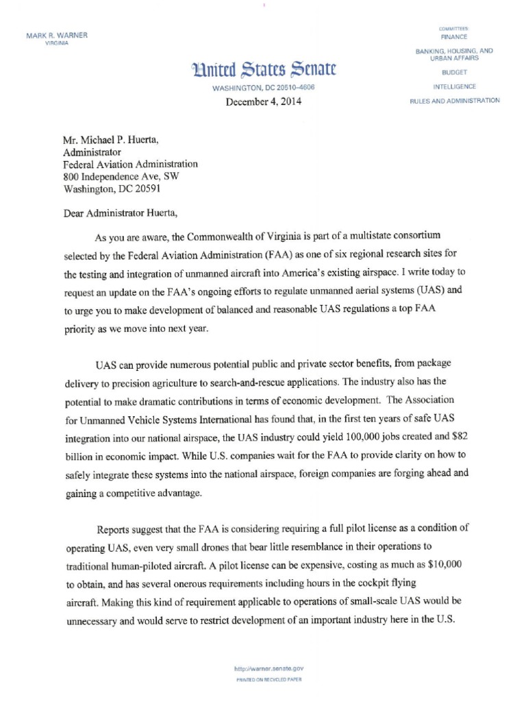 U.S. Sen. Mark R. Warner (D-VA) sent the attached letter to the FAA administrator today regarding the agency’s efforts to design effective regulations for unmanned aerial systems.