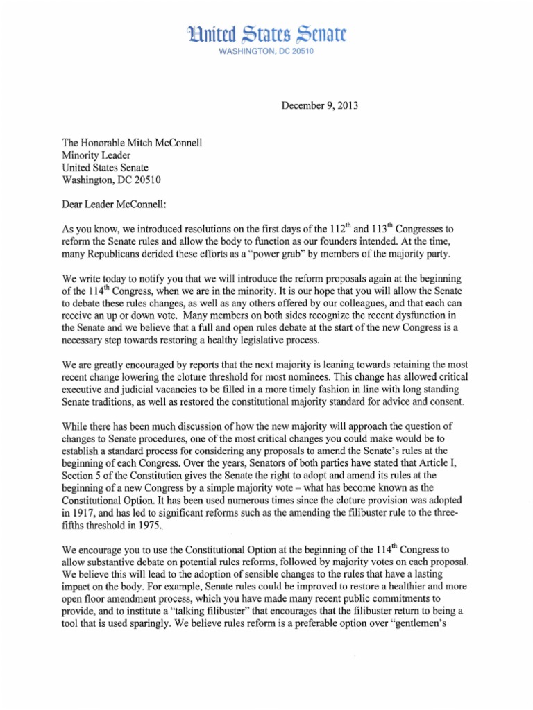 In a letter delivered today to incoming Senate Majority Leader Mitch McConnell, Senators Tom Udall (D-N.M.) and Jeff Merkley (D-Ore.) announced that they will continue their effort to reform the Senate rules on the first day of the next legislative session, and they urged McConnell to allow debate and support efforts to restore a healthy legislative process.